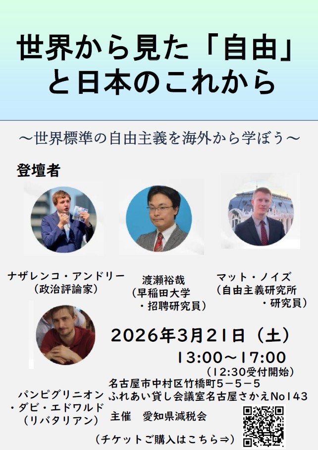 2026年3月21日 名古屋にて自由主義フォーラム 2026年3月4日 告知 2026年3月21日、名古屋市内の自由主義フォーラムに登壇いたします! https://taxcutlibertarianism.peatix.com